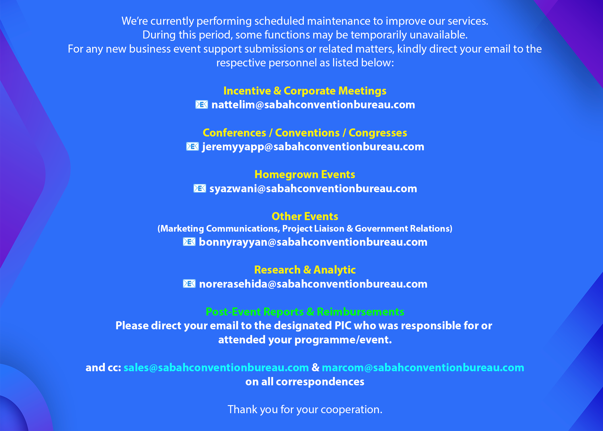 Sabah Convention Bureau berdedikasi untuk meningkatkan industri Mesyuarat, Insentif, Persidangan, dan Pameran (MICE), memastikan gabungan profesionalisme dan keunikan daya tarikan Sabah. Sama ada untuk delegasi domestik atau antarabangsa, Sabah menjanjikan pengalaman yang menawan dengan latar belakang keindahan alam semula jadi yang menakjubkan, budaya bertenaga dan tempat bertaraf dunia. Dengan komitmen terhadap kecemerlangan, kami menjamin setiap acara yang dianjurkan di Sabah akan meninggalkan kenangan yang berkekalan.